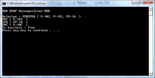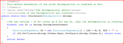 The implementation is simple. For all subschema obtained, we compute its closure using the dependencies of the original schema. It the resultant of the closure gives R for any of the subschema, then the decomposition is lossless. Now you might be confused and might be wondering if you need to write new code! to compute closure for schema. The answer is no! remember you have implemented closure method in the FunctionalDependency class. You can create a new FD whose LHS is Ri and RHS is empty and then call the method GetCLosure(). This works like magic and without any additional code! The complete code is listed below. Notice that we are not bothered if the decomposition is BCNF Decomposition or 3NF synthesis. We can check for any such decomposition for its losslessness nature.