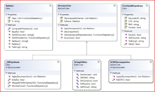 Clearly if we are going to implement normal forms, we would need to represent a "Relation", a "Functional Dependency", etc. So the way I organized the system can be seen below. It is a class diagram taken from Visual Studio. Click on the figure below to look at the classes involved.