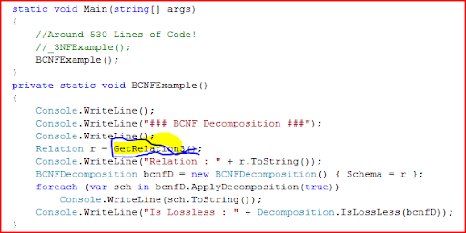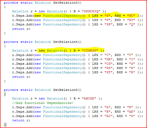 In the above code you can see other sample relations too. But look at the syntax for Object initializers. (the one marked in yellow). For both Relation as well as FunctionalDependency creation, we have made use of the beautiful initializers saving us atleast 50 lines of code for all the examples.