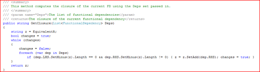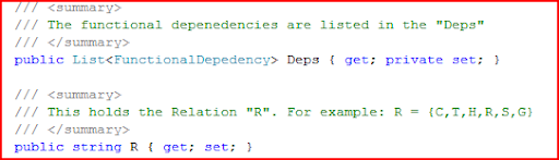 You can notice that I have a list of Functional Dependencies. I represent each FD as a seperate class called "FunctionalDependency". Assume for now that you have such a class. So what next? You might be interested to implement a closure algorithm, right? But I implemented in FunctionalDependency class. I would talk about the methods when and where required. For now, let us move on to the other important class
