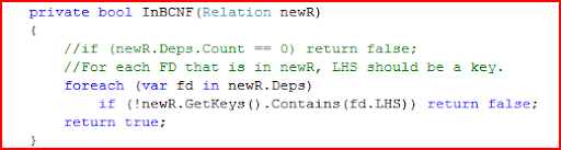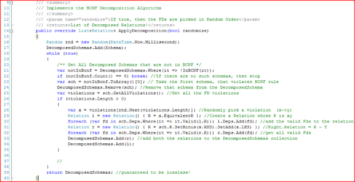 The code listing for the entire BCNF Decomposition is shown below.