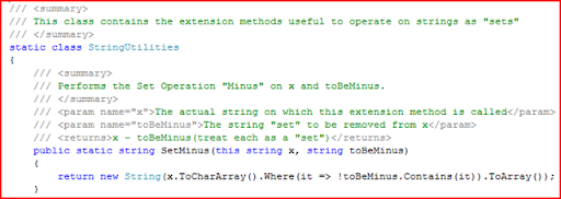 Note that the class is static and the method is static. Another point to note that the first parameter is marked as "this string" meaning we wish to make SetMinus() as an extension method to the string class. After this, we could use SetMinus() as shown below.