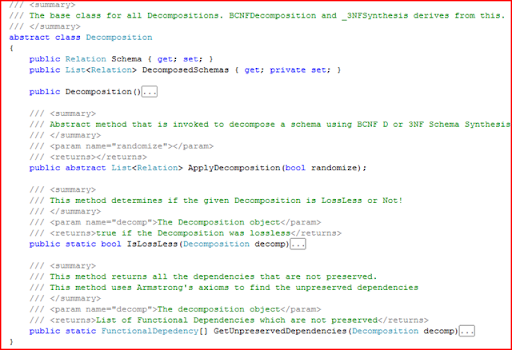 The method IsLossLess() takes in a Decomposition object and returns true if the decomposition is lossless and false otherwise. This is used to test our implementation of both BCNF decomposition and 3NF Sythesis - both of which are theoretically lossless. The Decomposition class defines an abstract method ApplyDecomposition() which should be implemented by the inheriting classes. It returns the list of decomposed schemas which is also the "DecomposedSchemas" property. I know schemas is not a correct word and a plural for schema is just schema, so forgive me. Now let us look at the BCNF Decomposition algorithm.