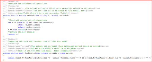 The SetAdd() makes use LINQ expressions to find all the unique characters that are in setToAdd and that are not in the actual expression. It also makes clever use of LINQ aggregator method Distinct(). One thing I noticed is that as a beginner developer you would pride in writing programs with more lines of code. But as you mature as a developer you would enjoy writing compact code and these days nothing gives me more satisfaction than writing one liner or two liner to do a good job.