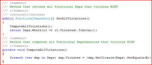 Now that we have looked at BCNF Decomposition and also a good C# 3.0 features that enables developers write some good compact code, we would look at 3NF synthesis in the next post. I hope this post is informative enough to get you started. I have shown all the code and with clever reading of Class diagram picture and the snippets you should be able to implement the decomposition algorithm by yourself.